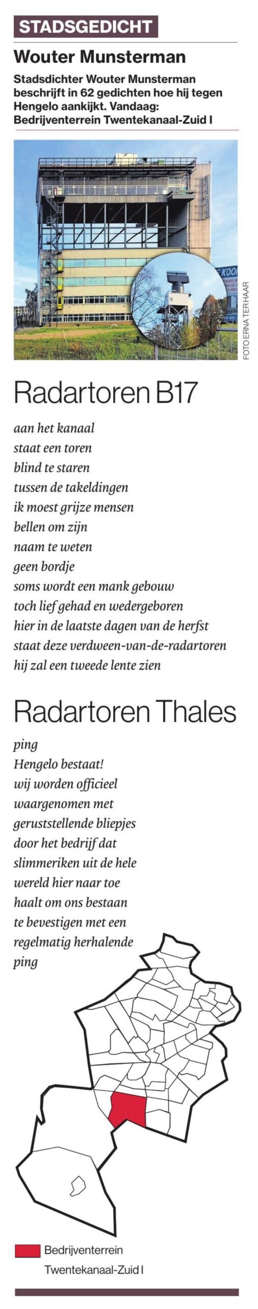 Stadsdichter Wouter Munsterman begon in 2022 aan een heel Hengelo omvattend project: ‘Hengelo in stukjes’. Het kadaster heeft de gemeente Hengelo in 62 buurten opgedeeld en gecodeerd, van BU1640000; binnenstadcentrum tot BU01640909; verspreide huizen Beckum. Van een dichtbebouwde plek met duizenden inwoners tot een groen gebied met 39 adressen. Wouter doet al deze buurten aan, laat zich inspireren door wie hij spreekt, wat hij ziet en wat er gebeurt, en schrijft er elke week een gedicht over. Fotograaf Erna ter Haar maakt er vervolgens een bijpassende foto bij.